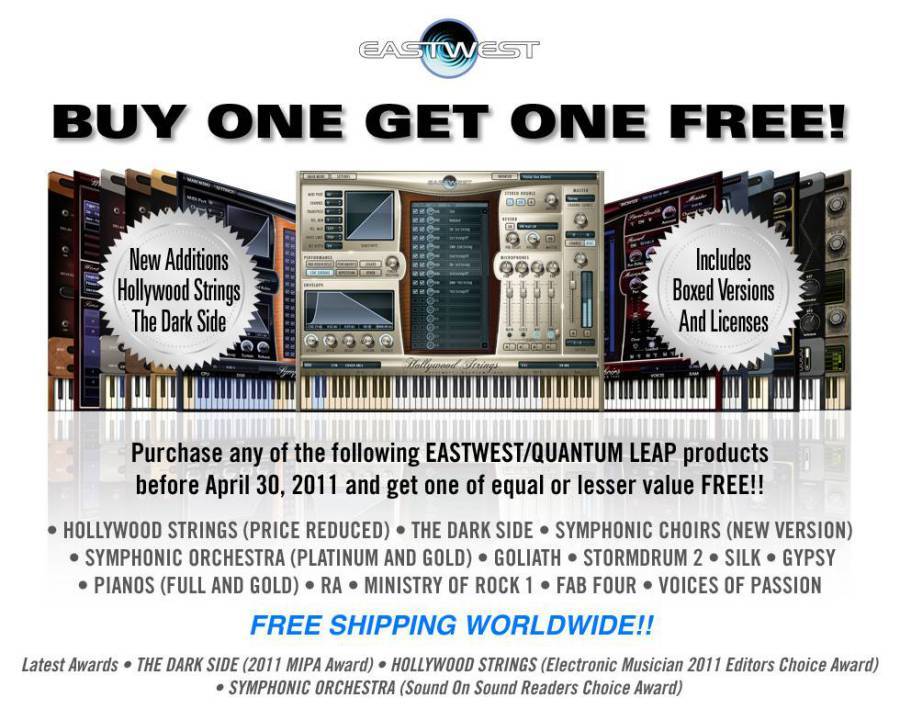 EastWest bzw. Soundsonline haben wiedermal ein tolles Angebot: Wenn man ein Produkt wie Hollywood Strings, Symphonic Choirs, The Dark Side, Stormdrum 2, Symphonic Orchestra, Goliath etc. kauft, bekommt man ein güstigeres/gleichteures Produkt umsonst !