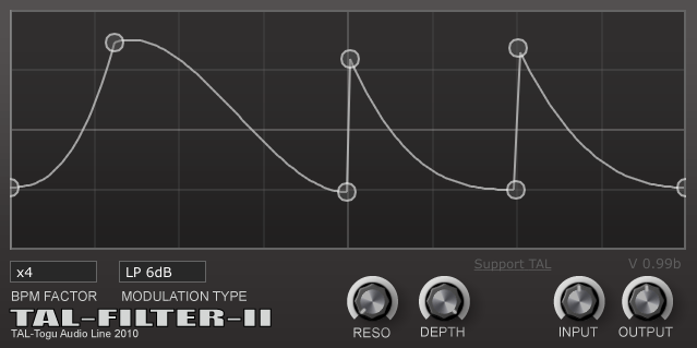 Release of TAL-Filter-2 version 0.99b. TAL-Filter-2 is a host synced filter module with different filter types, panorama and volume modulation possibilities. The device includes all 4x oversampled TAL-NoiseMaker filters: LP 24 dB, LP 18dB, LP 12dB, LP 6dB, HP 12 dB, BP 12dB, N 12 dB. Its possible to saturate / distort the input signal by raising the input volume with the input control (only if you use a filter as modulation type).