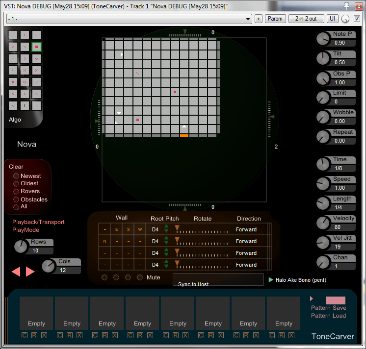 “Introducing Nova3, a generative sequencer based on the motion of rovers in a resizeable matrix. Nova3 generates MIDI notes when rovers strike a wall. Rovers change directions when they encounter walls, obstacles and other rovers. You can use this to generate static sequences, slowly evolving sequences, or wildy chaotic sequences.