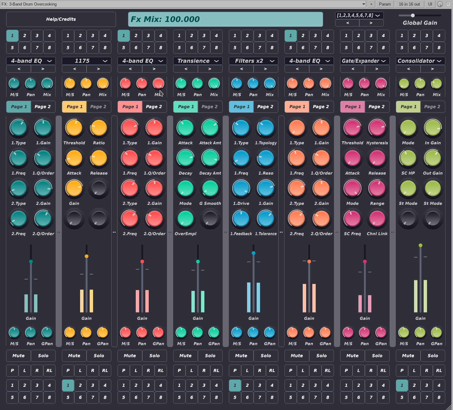 On top of that the 8 mixers can be divided on groups of 4 and 2 buses connected in series, with the equivalent effect as if two or four instances of the plugin were loaded on the host in series (with the reduced number of buses). This allows FX chains with paths in series and parallel, while not being fully modular (and with no wires).
