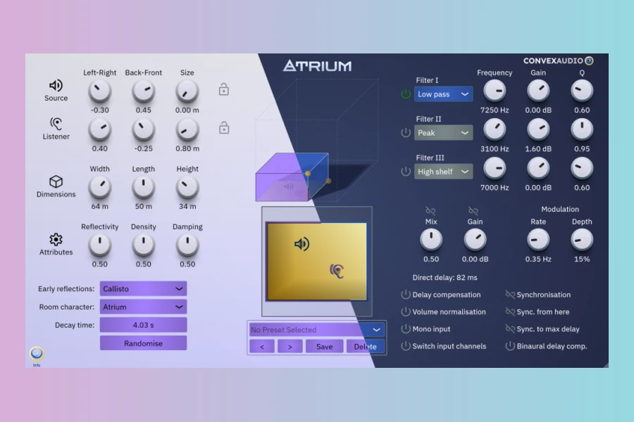 Atrium – Acoustic Space Simulation is a unique tool that empowers users to create custom acoustic environments. With Atrium, you can build your acoustic space from the ground up and position multiple instruments as well as the listener within a tailored room setup. This feature facilitates the creation of immersive soundscapes that accurately reflect spatial impressions with minimal effort.