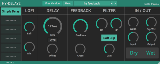HY-Plugins has relesed the new update HY-Delay2 – in a free and commercial version. The free version consists of a single delay mode instead of six delay modes in the commercial version (simple, stereo, twin, tap, pitch, filter) and you can’t store the effect parameters and saving is not possible.