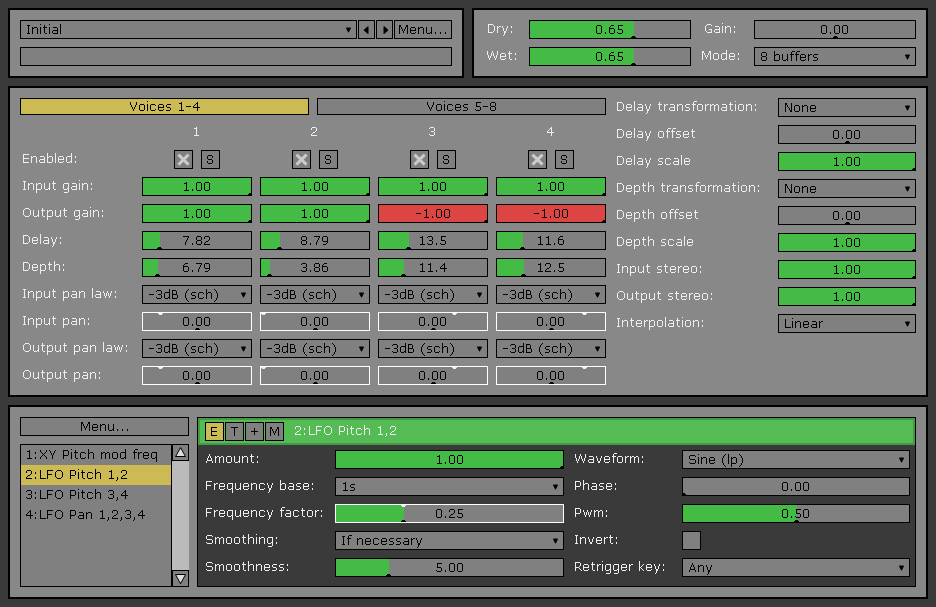 – Up to 8 independent voices – each with separate delay, depth, gain, pan and other options