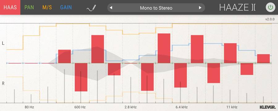 The upgraded Haaze v2 from Klevgrand is an elegant solution for controlling stereo width and spatially positioning a sound in a stereo mix. Regular L-R panning is a weak tool that doesn’t resemble real-world acoustics, which becomes clear when trying to place a mono sound naturally in a stereo mix (especially on headphones). The result still feels very “mono”. Haaze is an audio plugin that makes the positioning feel more natural, understandable and pleasant for the ears. It splits the audio signal into 16 frequency bands. On each band, you can delay the left or right signal (which will make the listener believe the sound arrives from the side that’s reaching the ear first), pan it to the left or right, or adjust the overall width on that band (for example, make the lower frequencies more focused in the middle than the higher). Haaze can also diffuse a mono signal and make it wider.