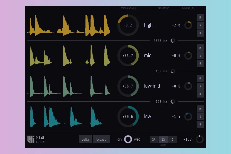 ST4b’s proprietary detection algorithm gives you control over even the fastest attacks – electronic drums, foley, raindrops, even single-sample impulses (if you’re so inclined). It’s precise enough that even the maximum boost or cut of 45dB sounds crisp and clean, and a smart auto-gain means you’re not constantly adjusting your gain staging. ST4b does it all with minimum CPU load and only 2 samples of latency.
