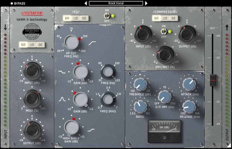 Speaking of those sounds, the UniChannel plug-in’s preamp, EQ, and COMPRESSOR sections are all switchable between BR (British), US (United States), and GE (German) flavourings. For example, that classic British channel switching brings about a fat-sounding transformer colouring for aggressive bass, kick drum, and rock attitude; it includes a Seventies-style British fat-sounding transformer preamp, a Seventies-style EQ, and a Seventies-style diode bridge compressor. Conversely, the US Eighties-style op amp preamp and Eighties-style EQ exhibit mid-sounding punch — perfect for electric guitar or toms, while the US early-Fifties-style tube compressor is a fat-sounding monster, making vocals sound silky smooth with wonderful colour to boot. But the full- sounding German channel works wonders on the drum buss and sounds so magical when applied to the voice that SounDevice Studio engineers do not recommend using anything else for jazzy stylings or ballad intimacy; it features a Fifties-style tube preamp, Sixties-style rare EQ, and early-Fifties-style tube vari-mu compressor.