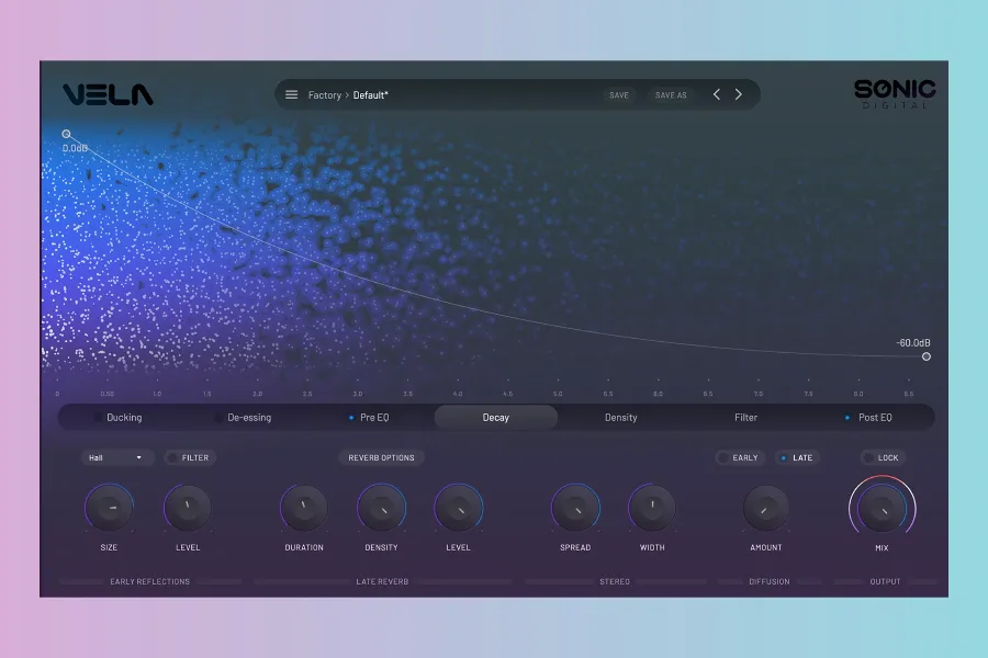 Vela gives you total control over every aspect of a reverb’s architecture with its fully customizable early reflection system combined with a node based late reflection engine enabling you to finely tune density, decay and damping filter over time for a luscious, smooth tail.