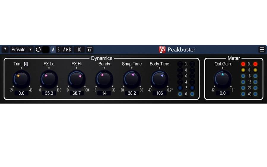 The amount of effect can be chosen independently for the lower and higher frequency ranges: this permits use of Peakbuster on a variety of program material, both full mixes and individual tracks.