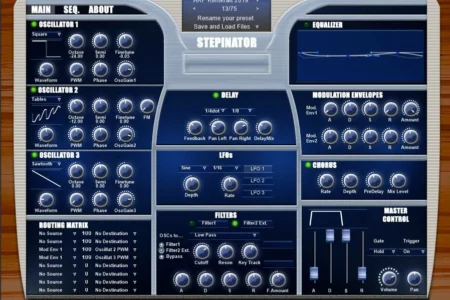 Stepinator combines a multi-step-sequencer and wavetable-synthesizer. This windows-specific VST-plugin has got three oscillators with lots of basic and wavetable waveforms. Two Filters and a lush modulation-matrix and three LFOs are