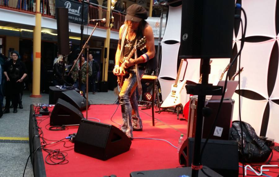 Auf der großen Showbühne war unter anderem Zacky Tsoukas zu Gast, der seine schlagkräftigen Künste an seinem Pearl-Drumset vorführte. Jan Richter, der auch schon als Gitarrist bei „Deutschland sucht den Superstar“ aktiv war, demonstrierte den wuchtigen, harmonischen Klang am Yamaha-Verstärker THR 10. Highlight der Messe war der Auftritt von Ryan Roxie, der vielen auch als Gitarrist an der Seite von Alice Cooper bekannt sein dürfte.
