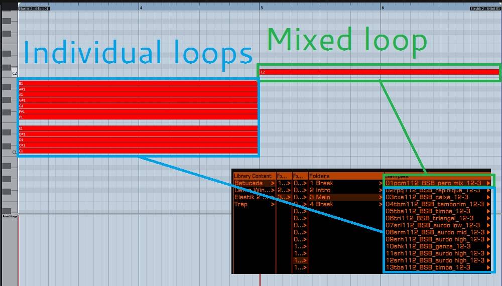 Unfortunately the final mixed loop (xzy_perc_mix) that acts as the reference, sounds different as the sum of all individual instrument loops (see screenshot). Even after adjusting the volumes of the individual loops/ stems the mixed version sounds slightly different. I guess there was some reverb added in the mixed loop. (screenshot)