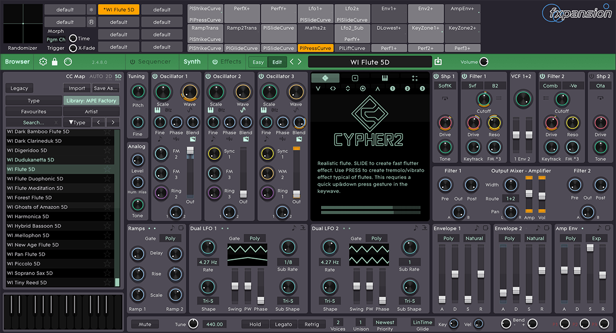 “Cypher2” is designed for deep sonic exploration and expressive performances. It features a vast range of sound design tools and over 1300 sounds, including 500 MPE-optimised presets. Experience an unparalleled