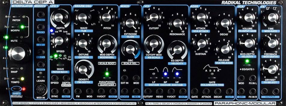 Radikal Technologies’ DELTA CEP A can function as a standalone synthesizer or — when removed from the chassis — a 68HP-occupying Eurorack module forming the centre of a powerful modular