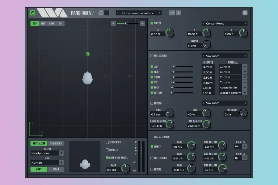 Panorama is a virtual acoustics processor that can produce stunningly realistic auditory scenes for playback over headphones or loudspeakers. Panorama uses 3-D audio and acoustic environment modeling technology to simulate
