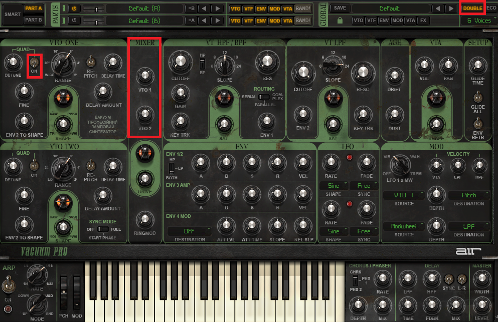 Lade den Synthesizer Vacuum Pro in einen beliebigen Sequencer und wähle aus der Global-Section das „Default“-Preset. Automatisch befinden wir uns damit auf der Ebene PART A. Zur Kräftigung des Grundsounds, genügt ein Klick auf On vom Detuning-Quad-Regler in der VTO ONE-Sektion, sowie der schon aktivierte DOUBLE-Modus rechts oben. Weil wir den Sound anhand von PART B noch später verstärken werden, reduzieren wir die VOLUME-Regler der beiden Oszillatoren VTO 1 sowie VTO 2 in der Mixer-Sektion auf -1.0 dB. Die genauen Werte werden stets im Display des Presetnamens dargestellt.