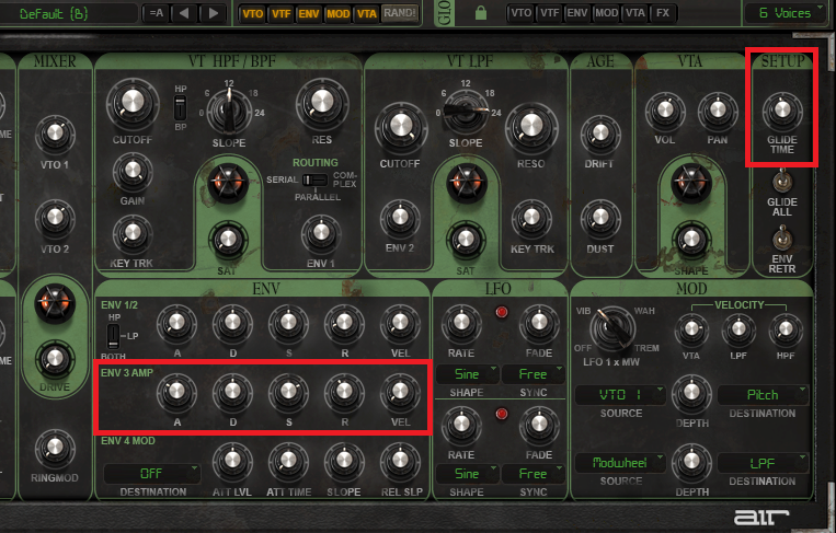 Um einen gleitenden Drift zwischen zwei angespielten Noten zu erzielen, erhöhen wir den GLIDE TIME-Regler in der SETUP-Sektion auf mindestens 300 Millisekunden. Für einen behutsameren Anstieg des Sounds, wird die Attack der ENV 3 AMP, also der Lautsärkenhüllkurve, auf rund 100 ms angehoben und die Decay mittig positioniert. Sustain wird auf 74 Prozent reguliert, sowie Release auf 245 ms.