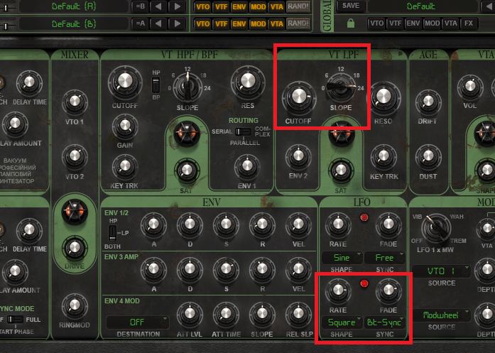 Setze den Slope-Regler der VT LPF-Sektion für die anschließende Filtermodulation auf 24. Damit wird die Flankensteilheit von 24dB pro Oktave für das LowPassFilter (LPF) eingestellt. Der Cutoff wird, wenn auch nur sehr geringfügig auf 85 Prozent herabgestuft. Das Zerhacken von Flächen- und Padsounds ist ein beliebtes Stilmittel in der elektronischen Musik. Besitzt der eigene favorisierte Synth keinen Step-Sequencer oder ein trancetypisches Gate, lässt sich dies trickreich per Squareauswahl an einem LFO realisieren. Dies ist ein universeller Tipp und nicht nur für spezifisch für Vacuum Pro. In diesem Workshop wird aber nur das Filter rhythmisch zerhackt, und dazu wird die Rechteckwellenform Square als SHAPE für den unteren LFO gewählt, so dass ein Signal nur positive oder negative Werte kennt und ähnlich wie beim Gate nur geöffnet oder geschlossen werden kann. Setzte zudem die RATE auf 1/16. Damit die Modulation synchron zum Songtempo verläuft, wählst du Bt-Sync für den SYNC-Modus aus. Mit dem FADE– Regler kann das Gating subtil ansteigen und sich in der Intensität steigern. Stelle den Regler auf rund 12 Sekunden.