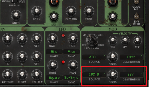 Damit der Sound zu gaten und pulsieren beginnt, setzen wir den LFO 2 in der MOD-Sektion ein. Dazu wählen wir im unteren SOURCE-Slot LFO 2 aus, sowie als Modulationsziel (DESTINATION) den zuvor justierten LPF (Low Pass Filter). Zusätzlich drehen wir die DEPTH auf mindestens +60 Prozent.