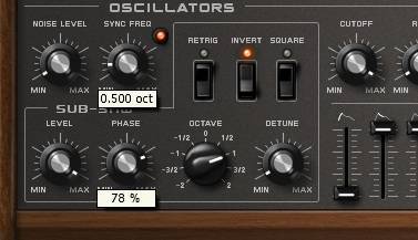 Lade zur Violin-Simulation Sawer[1] in deine DAW deiner Wahl und suche aus dem Options-Menü den Befehl „Reset Program“. Drehe dann in der Oscillators-Sektion den Sub-Saw Level ganz nach rechts und den Phaseregler auf 78 Prozent. Erhöhe dazu den Octaveregler auf 1 und aktiviere den Invert-Schalter. Zudem justierst du den Sync Freq-Regler auf 0.500 und klickst auf dessen Aktivitätsleuchte.