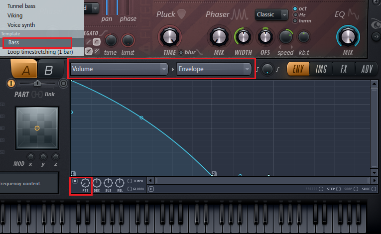 Stabs sind kurze, attackreiche Elemente, die, wie in diesem Beispiel, am Soundende gern mal in der Tonhöhe etwas abfallen. Öffne dazu Harmor [1] in deinem Host-Sequencer und wähle als Vorlage das Template-Preset Bass aus. Zudem wählst du aus dem Editor-Menü den Eintrag Volume aus, um eine Lautstärken-Hüllkurve wie abgebildet einzuzeichnen. Vergiss nicht die Hüllkurve zu aktivieren.