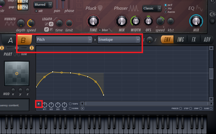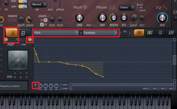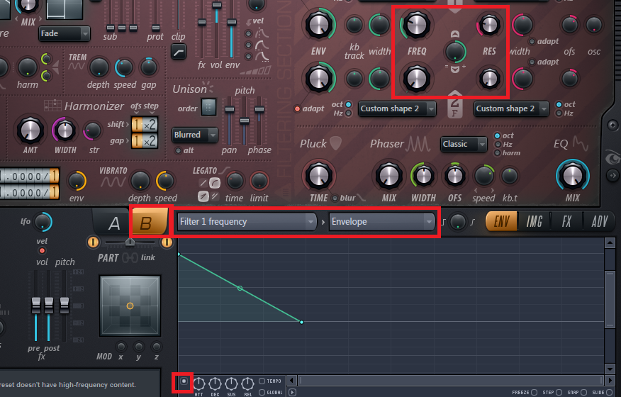 Zeichne für A und B eine Filter-Hüllkurve ein und aktiviere diese jeweils. Für B sollte die Fiterhüllkurve etwas kürzer andauern als für Seite A. Im Anschluss veränderst du oben die Filter-Einstellungen zunächst auf Seite A. Drehe dazu den FREQ-Regler fast gänzlich nach links und positioniere den RES auf 10-Uhr. Die Filtereinstellungen für Seite B entnimmst du der Abbildung.