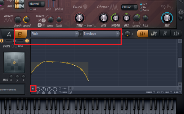 Wechsel dann von Seite A zu B, aktiviere zudem B und zeichne dort eine ähnlich kurze Volume-Hüllkurve ein. Kehre dann zurück zu Seite A und wähle aus dem Editor-Menü den Befehl Pitch aus. Aktiviere hier ebenfalls die Hüllkurve und zeichne für Seite A eine der Abbildung ähnelnde Pitch Hüllkurve ein. Per Rechtsklick lassen sich stets neue Hüllkurven-Punkte hinzufügen.