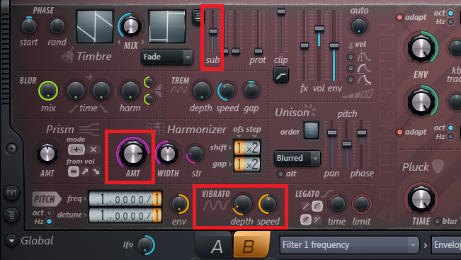Füge dem Sound mehr tieffrequentes Volumen hinzu, indem du den kleinen sub-Regler für A auf etwa -4 dB und für B auf 0 dB erhöhst. Stelle zudem den Mischungsregler AMT aus der Harmonizer-Sektion für A auf 100 Prozent und für B auf rund 80 Prozent. Bei Bedarf kannst du den Sound zudem mit einem Vibrato anreichern. Passe dazu Speed und Depth an dein Songtempo an.